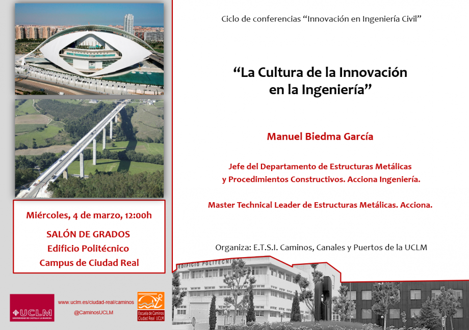 Charla de D. Manuel Biedma García (Jefe del Departamento de Estructuras Metálicas y Procedimientos Constructivos. Acciona Ingeniería. Master Technical Leader de Estructuras Metálicas. Acciona), en el marco del ciclo de conferencias "Innovación en Ingeniería Civil".