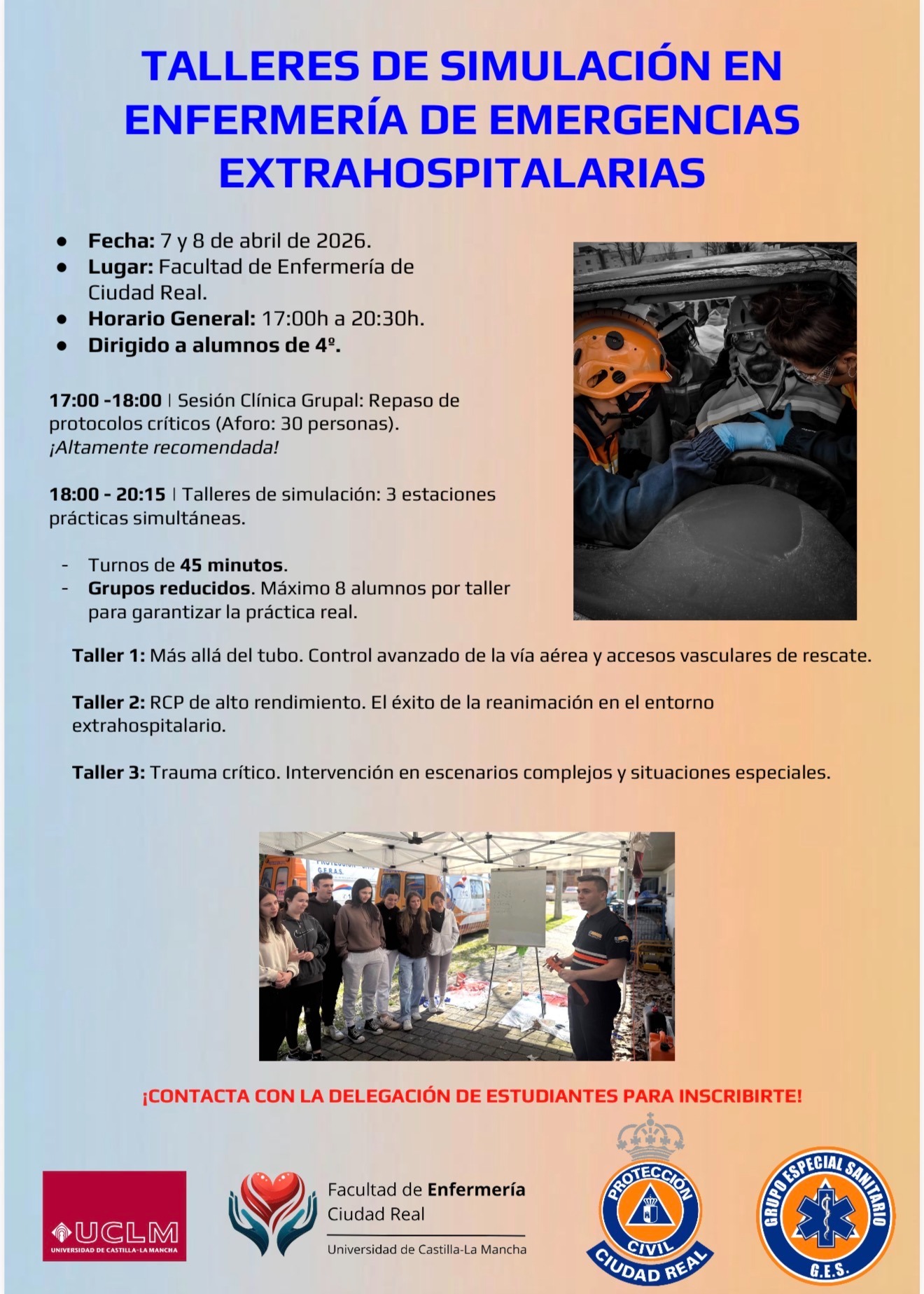 Con motivo de la Semana Cultural, se han programado para el alumnado de 4º curso los talleres de Simulación en Enfermería y Emergencias Extraospitalarias, en los que podrán enfrentarse a distintos escenarios prácticos y desarrollar las habilidades necesarias para su correcta resolución.