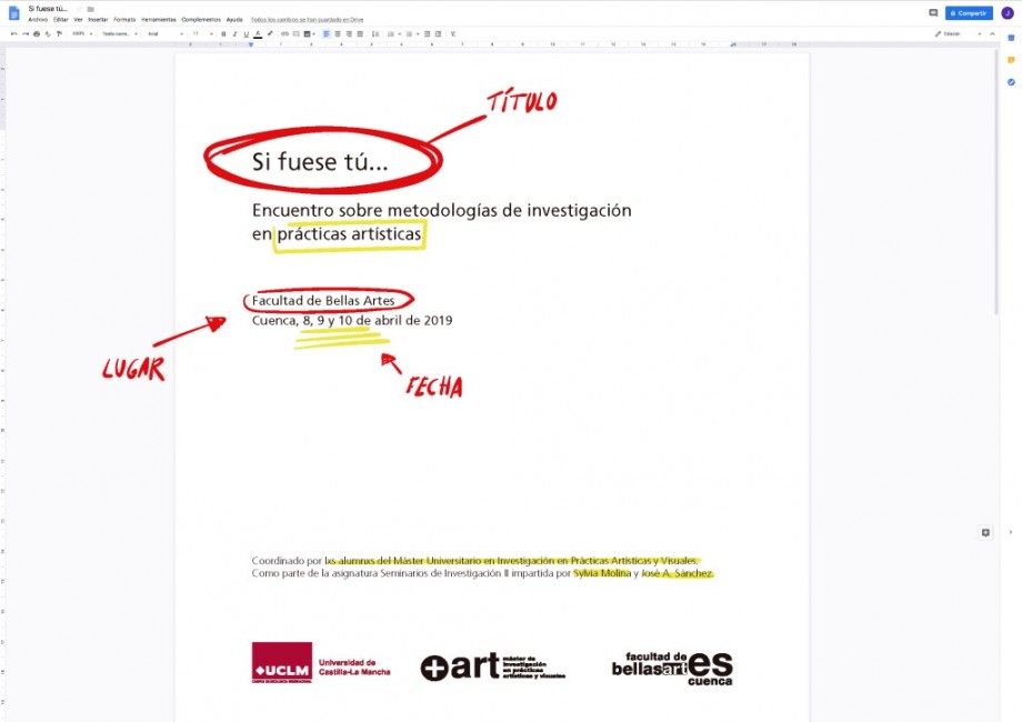 El próximo lunes 8 de abril comienza en la Facultad de Bellas Artes de Cuenca un Encuentro sobre metodologías de investigación en arte, que lleva por título Si fuese tú. La apertura oficial del Encuentro será a las 10.15 en el Aula 111 de la Facultad, y a ella asistirá el Vicerrector de Investigación, José Julián Garde, el decano de la Facultad, Javier de Baldeón, la profesora Adriana Urrea, en representación de la Universidad Nacional de Colombia. A ello seguirá una ponencia marco a cargo de la doctora Selina Blasco, profesora de historia del arte en la Facultad de Bellas Artes de la Universidad Complutense de Madrid.