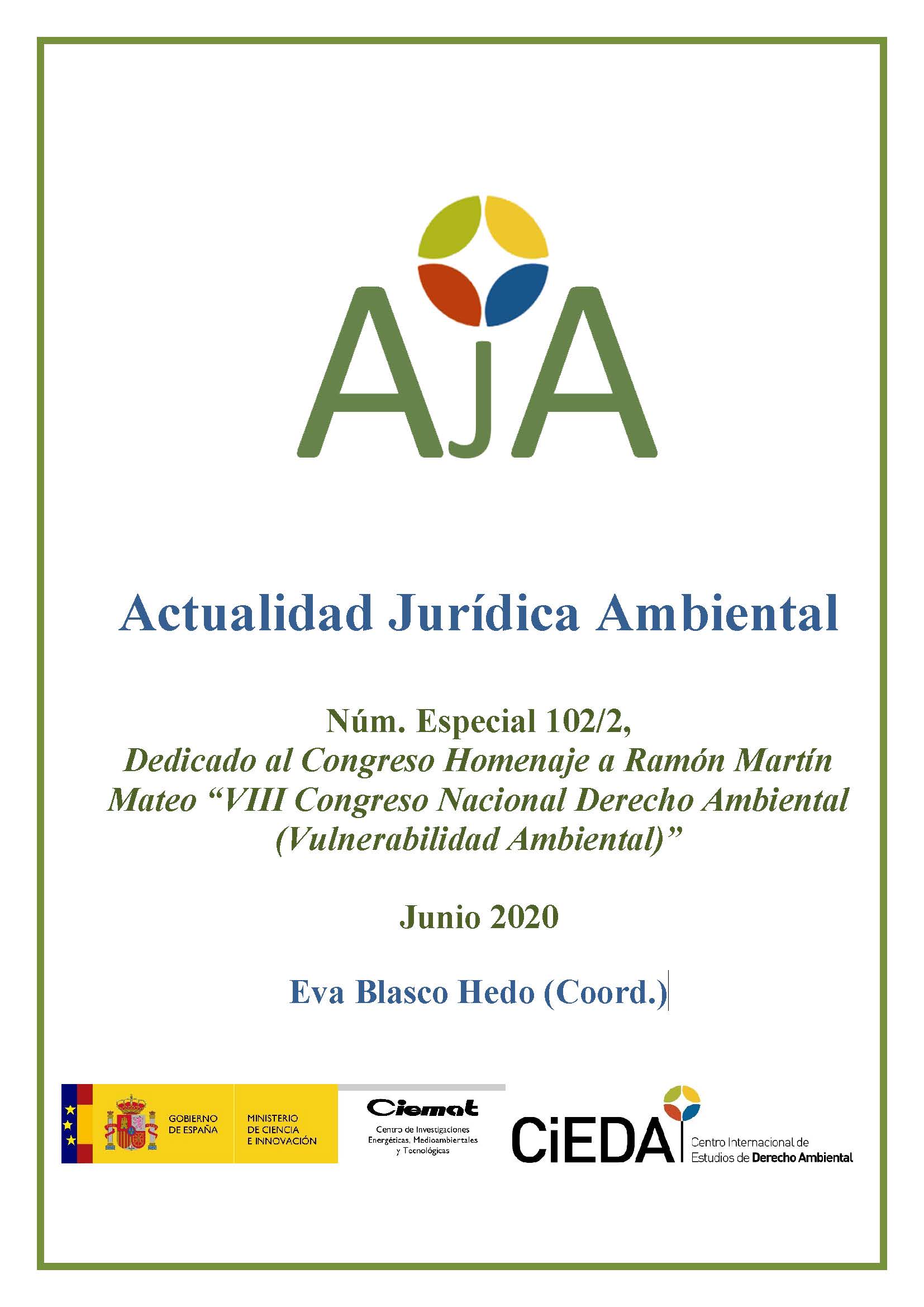 A continuación, ponemos a disposición de todos los interesados, el número especial 102/2 de junio de 2020 de Actualidad Jurídica Ambiental dedicado al Congreso Homenaje a Ramón Martín Mateo "VIII Congreso Nacional Derecho Ambiental (Vulnerabilidad Ambiental)" que se puede consultar a través del siguiente enlace.